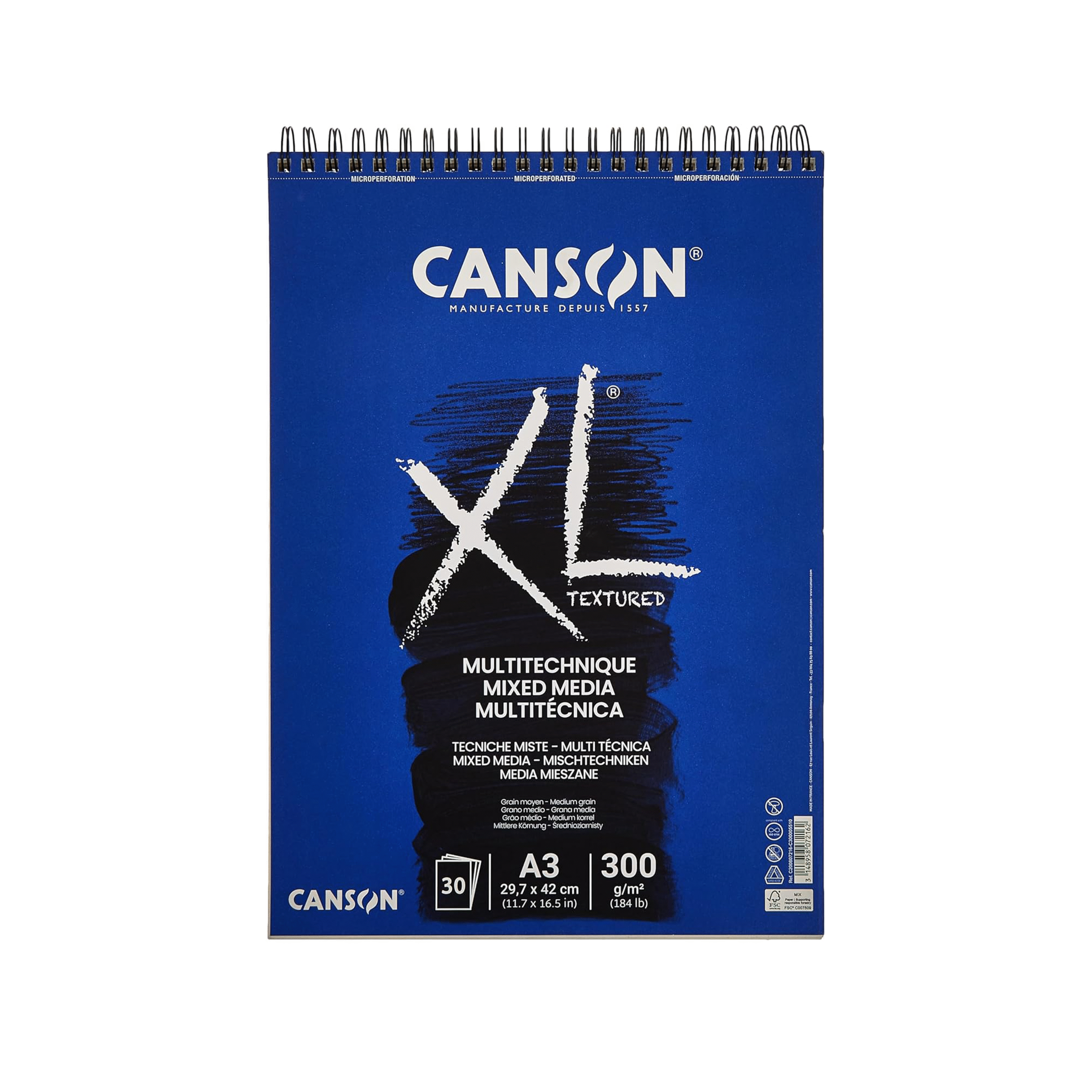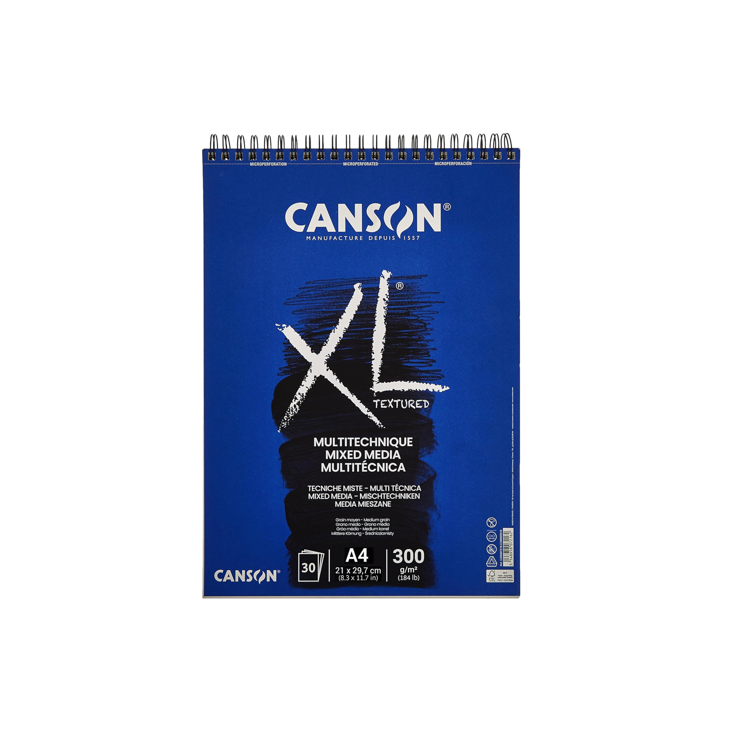 Canson XL Textured Mixed Media 300gsm A3 & A4 Paper, Medium Grain, Spiral Pad Short Side, 30 White Sheets, Ideal for Professional Artists & Illustrators