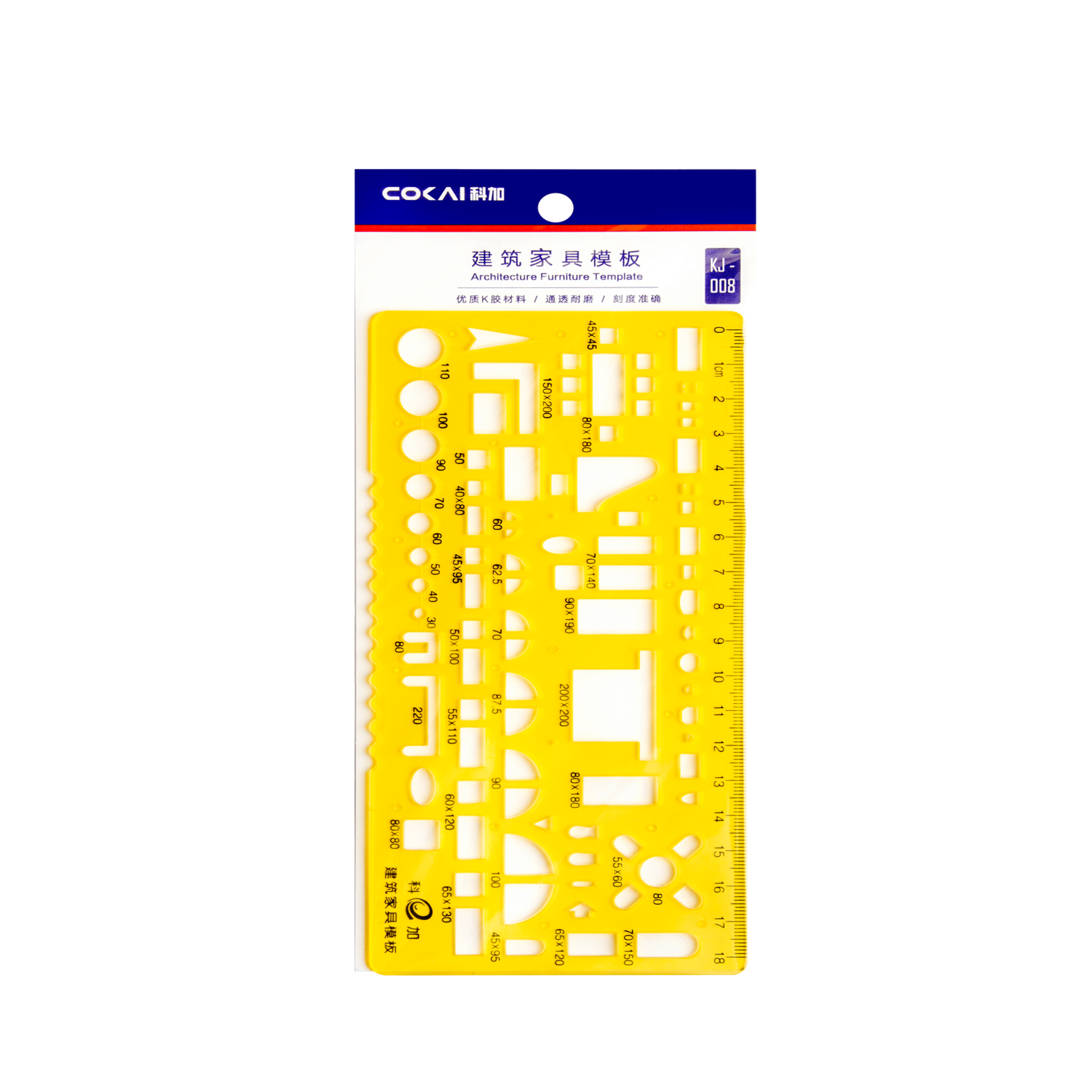 • KJ-008 Architecture Furniture Template (1:100 Scale): Perfect for standard architectural floor plans. This compact stencil packs a wide variety of symbols into a 1:100 ratio for efficient spatial planning.