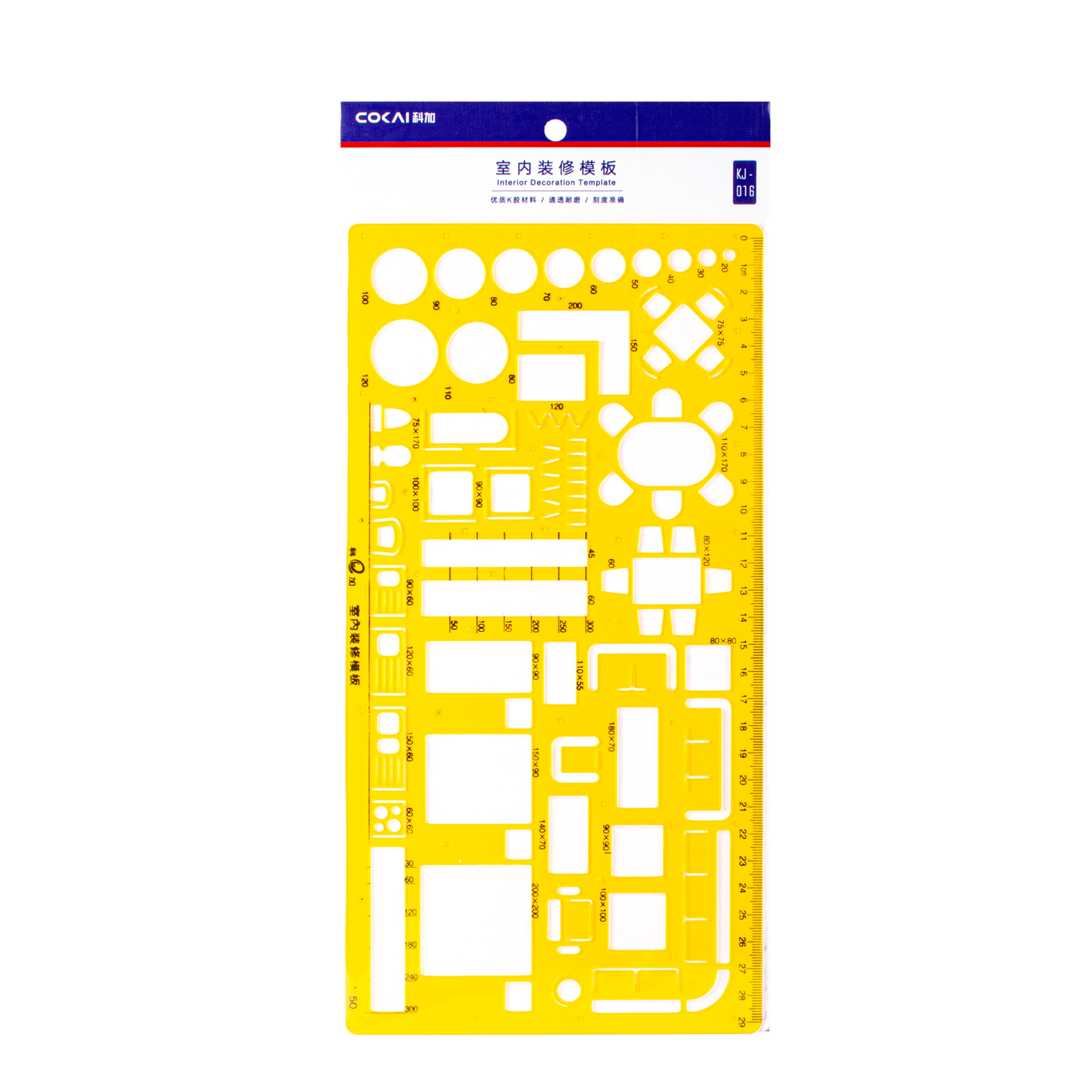 • KJ-016 Interior Decoration Template (1:50 Scale): Ideal for detailed interior design. Larger cutouts allow for precise placement of furniture, kitchen layouts, and bathroom fixtures in 1:50 scale drawings.