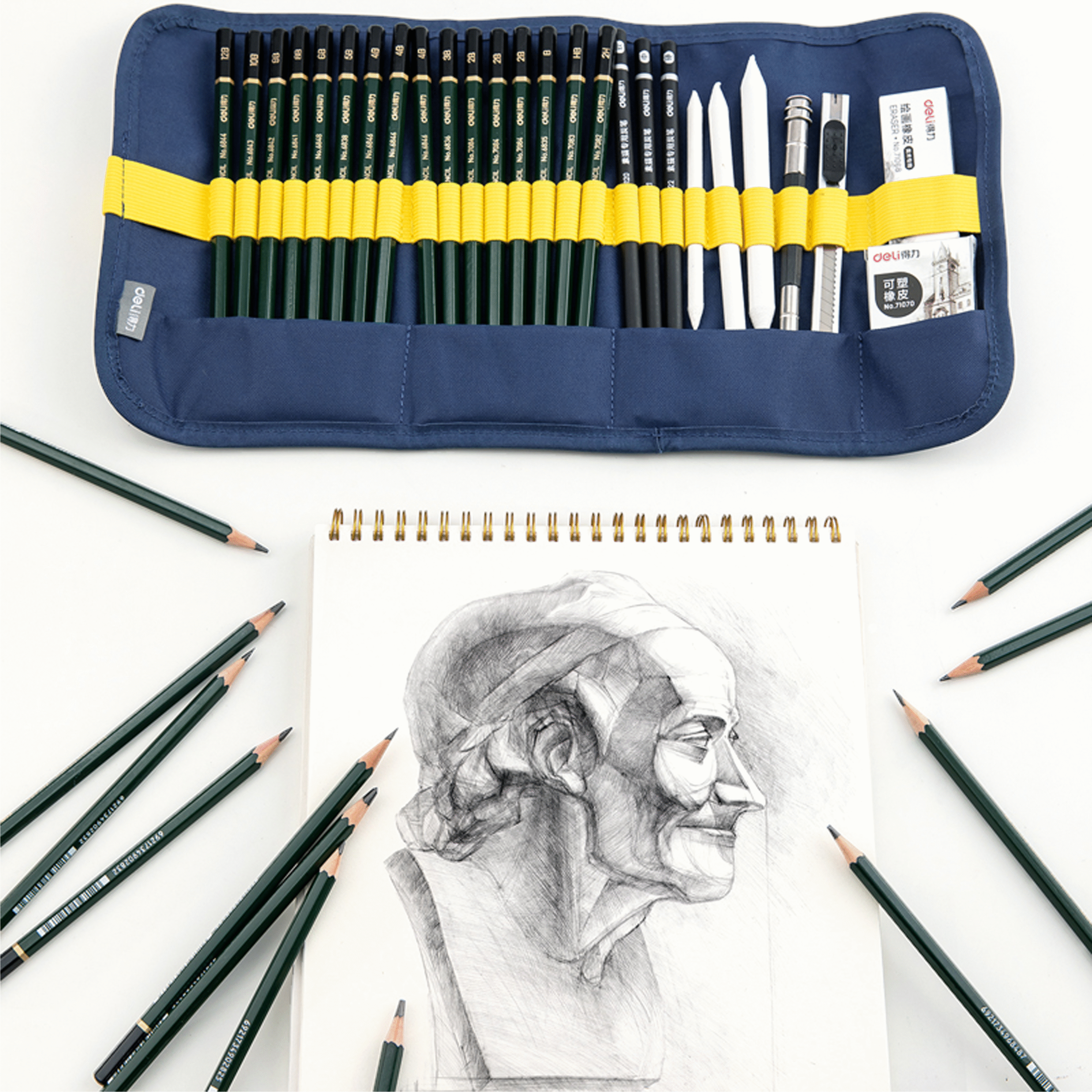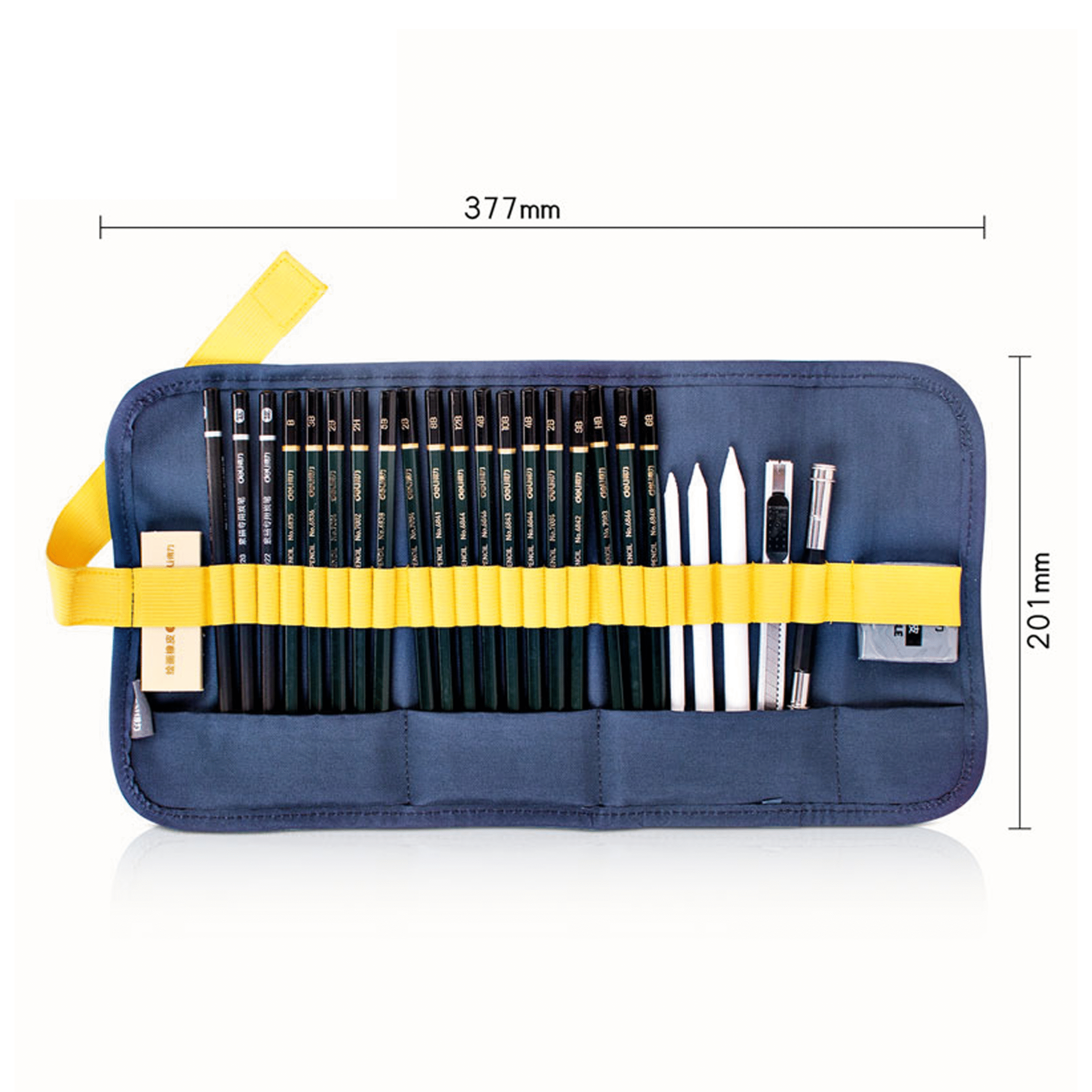 Deli 27-Piece Professional Sketching & Drawing Set – Includes Graphite Pencils, Charcoal, & Portable Roll-Up Canvas Case