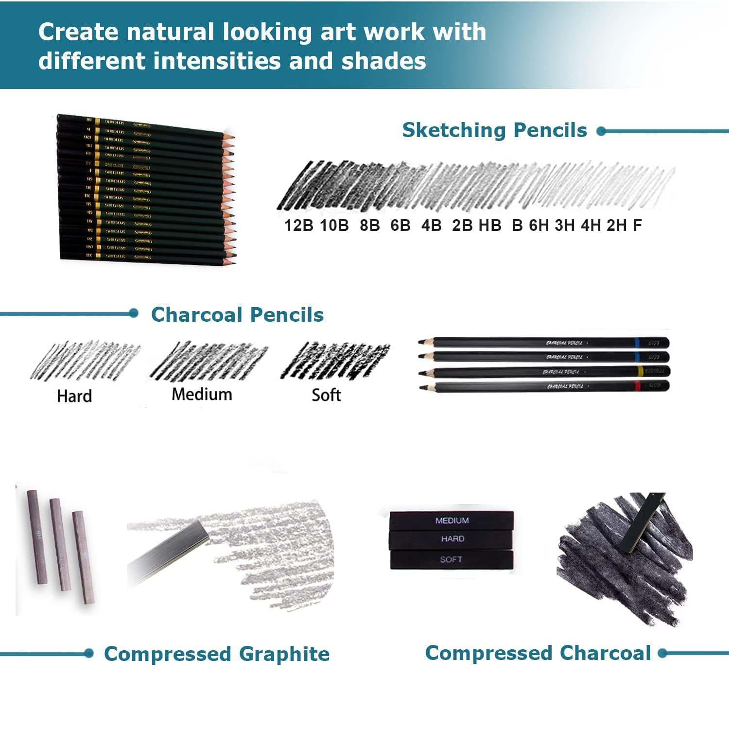 Charcoal & Specialty Pencils: Includes soft, medium, and hard charcoal pencils, plus white charcoal and woodless graphite for expressive textures.