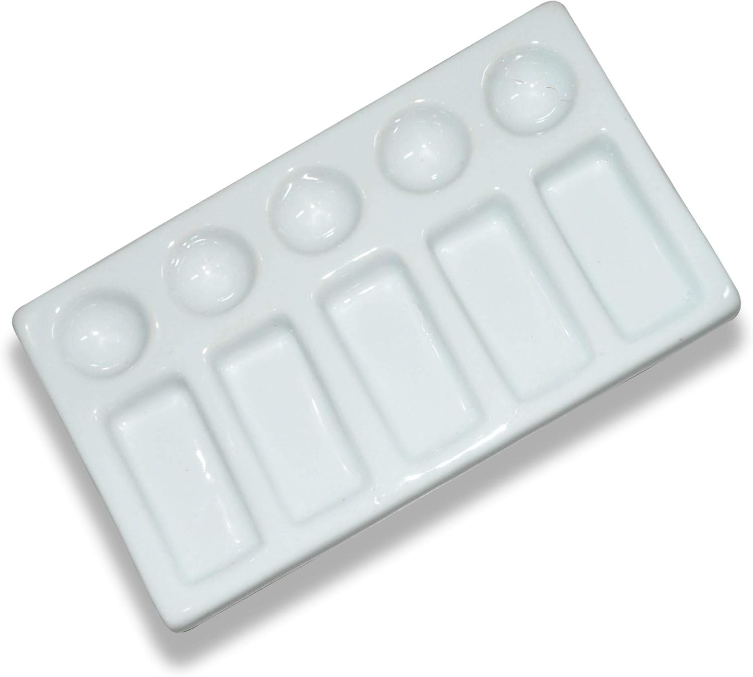 - Molded plastic painting palette is 4.4″ wide and 7.5″ long and contains 5 small 1.2″ by 0.4″ deep wells and 5 sloped rectangular wells that are ideal for holding and separating different paint colors.