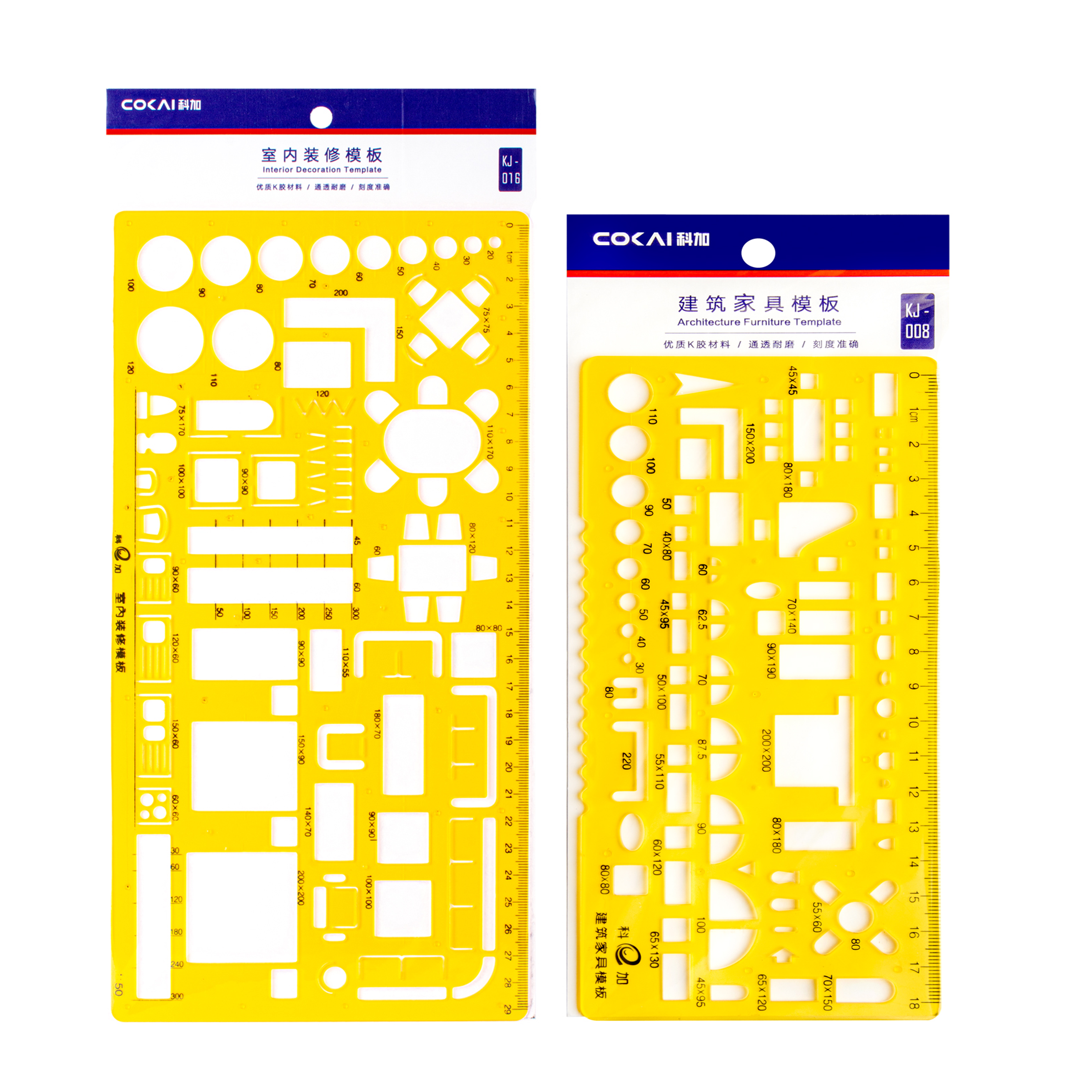 High-quality scales made from high-impact plastic with white, non-reflecting, matte faces and tapered edges. Printed graduations and color-coded furrows. Set of two, one architect and one engineer.